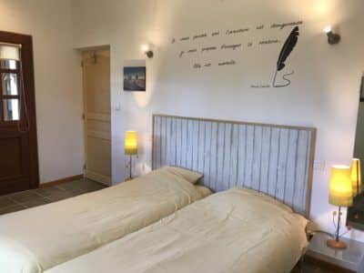 Au rez de chaussée; une grande chambre avec un lit 2 personnes (160×200), chevets avec lampes, deux armoires.